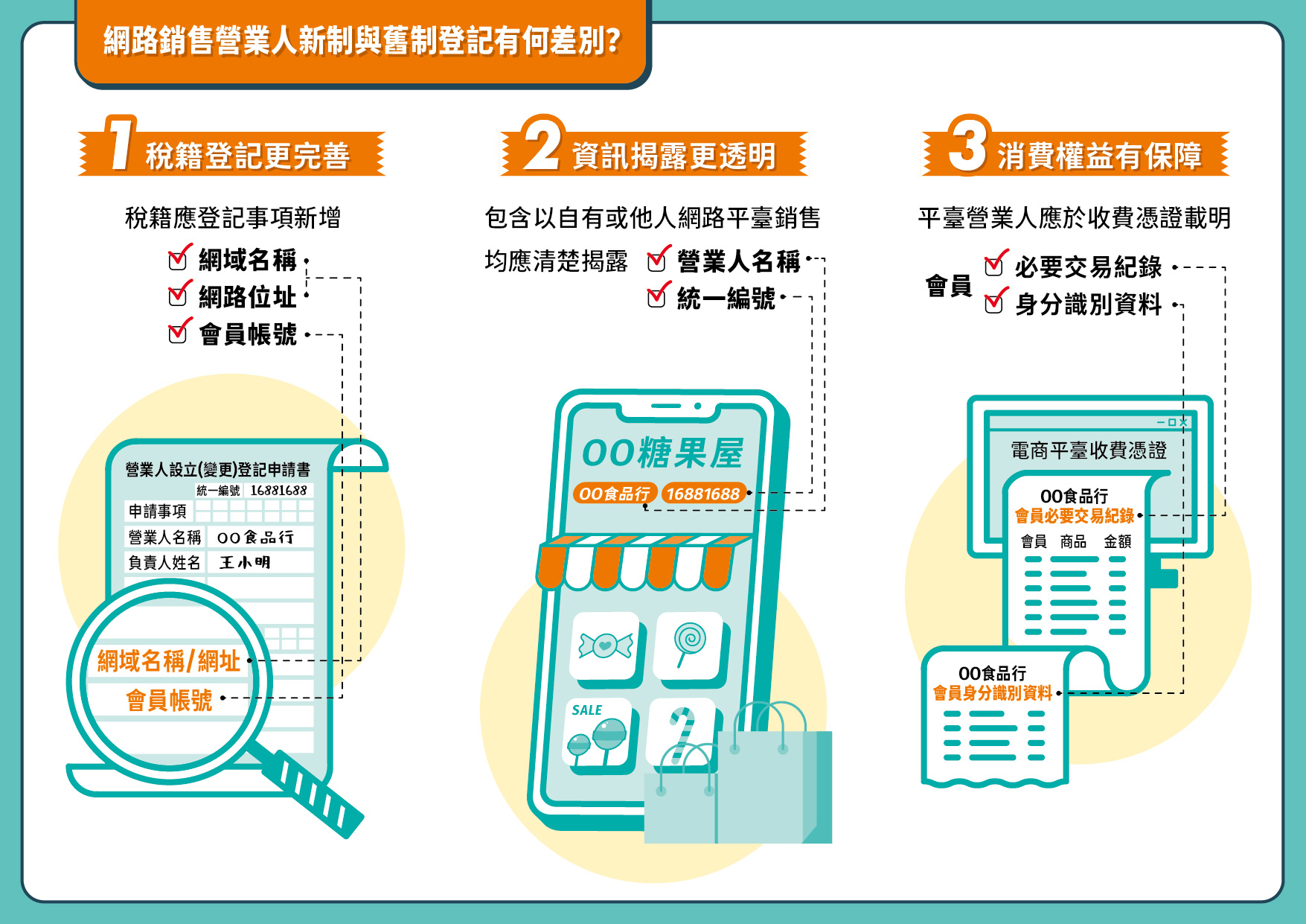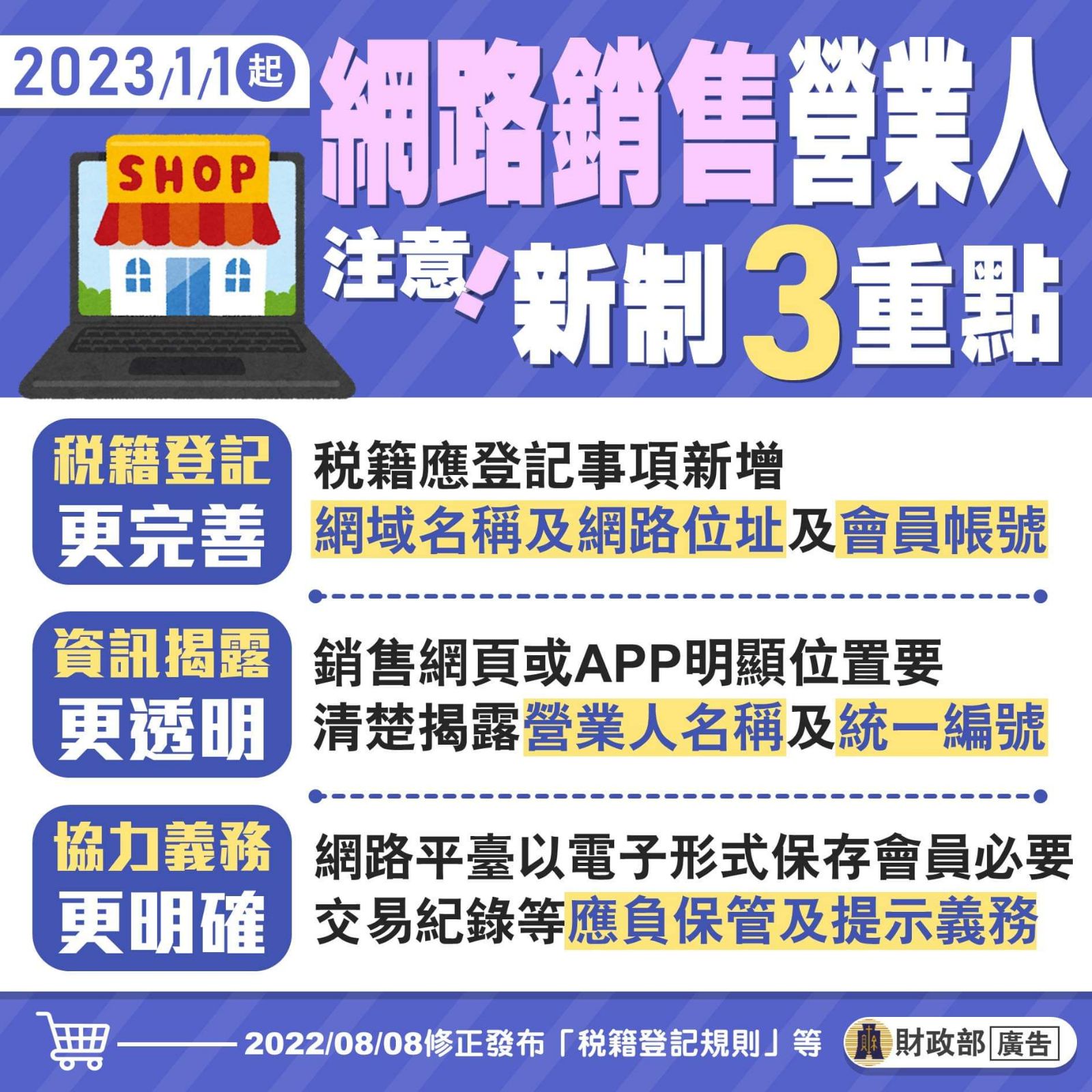 2023年「網路銷售營業人新制」上路,如果您有在網路上賣東西,儘早完成相關作業,以免受罰唷!,網路賣家稅籍應登記事項及網頁APP揭露報你知!需揭露「營業人名稱」及「統一編號」